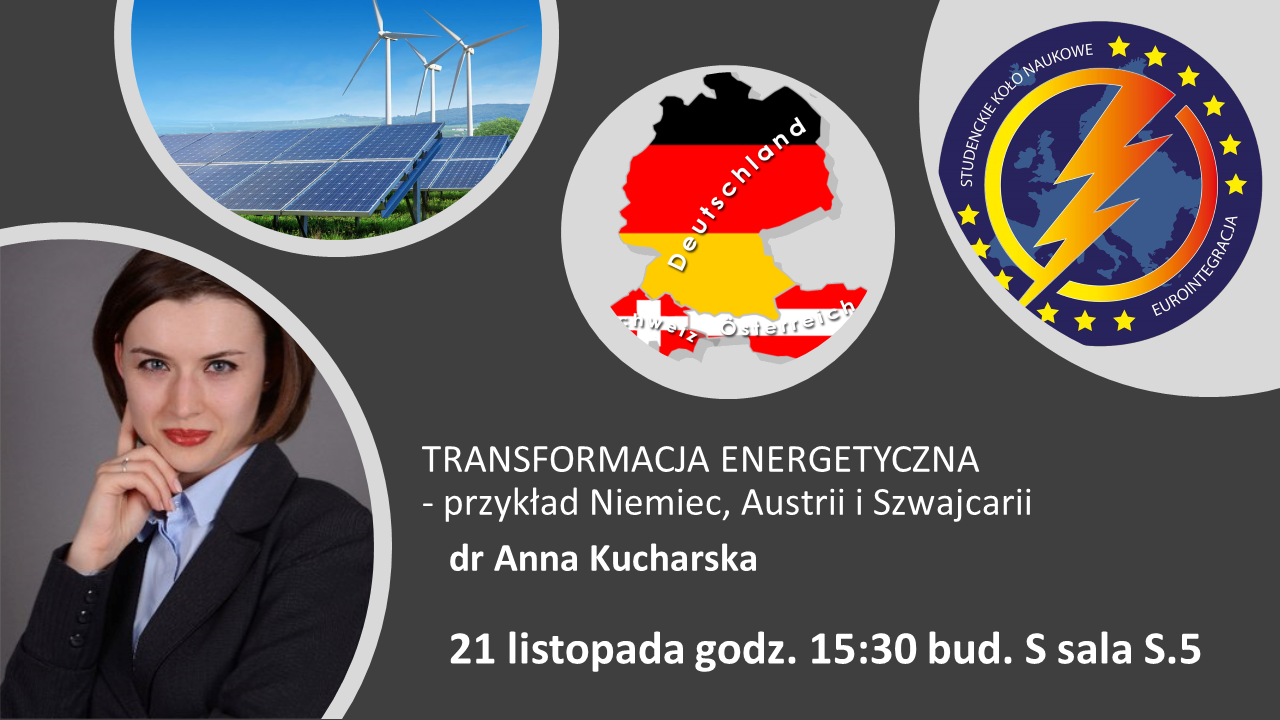 Transformacja energetyczna – przykład Niemiec, Austrii i Szwajcarii – to temat spotkania, jakie w dniu 21 listopada poprowadzi dr Anna Kucharska (początek godz. 15.30 – sala S.5).