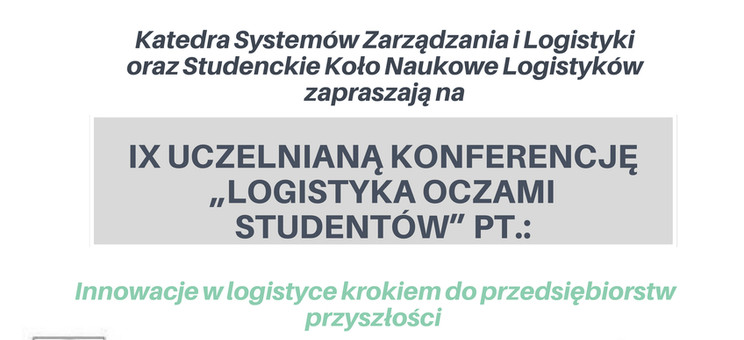 Kierownik Katedry Systemów Zarządzania i Logistyki dr hab. Andrzej Gazda, prof. PRz, opiekun naukowy Studenckiego Koła Naukowego Logistyków dr Magdalena Szydełko oraz przewodnicząca koła inż. Joanna Wilk wraz z członkami Komitetu Organizacyjnego pragną zaprosić pracowników i studentów Wydziału Zarządzania na IX Uczelnianą Konferencję z cyklu „Logistyka oczami studentów” pt. Innowacje w logistyce krokiem do przedsiębiorstw przyszłości. Odbędzie się ona 23 maja 2018 roku (środa) w godzinach od 9.00 do 14.30 w sali P-24. Podczas tegorocznej konferencji wystąpi 16 prelegentów. Komisja konkursowa wyłoni trzech młodych adeptów logistyki w kategorii „najlepsze wystąpienie”.