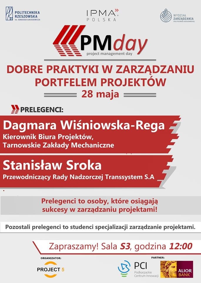 Wydział Zarządzania Politechniki Rzeszowskiej po raz kolejny zaprasza na PMDay. Hasło przewodnie tej edycji seminarium to „Dobre praktyki w zarządzaniu portfelem projektów”.