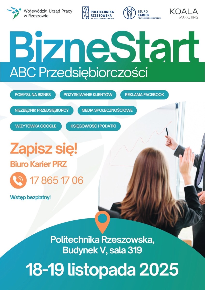 Biuro Karier Politechniki Rzeszowskiej wraz z Wojewódzkim Urzędem Pracy w Rzeszowie oraz Koala Marketing zapraszają studentów i osoby zainteresowane prowadzeniem własnej działalności na dwudniowe wydarzenie BizneStart – ABC Przedsiębiorczości.