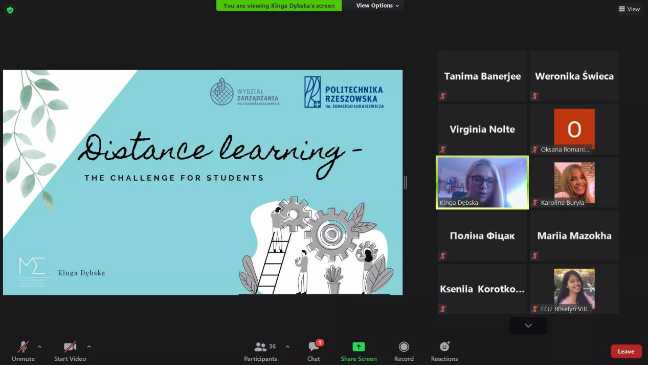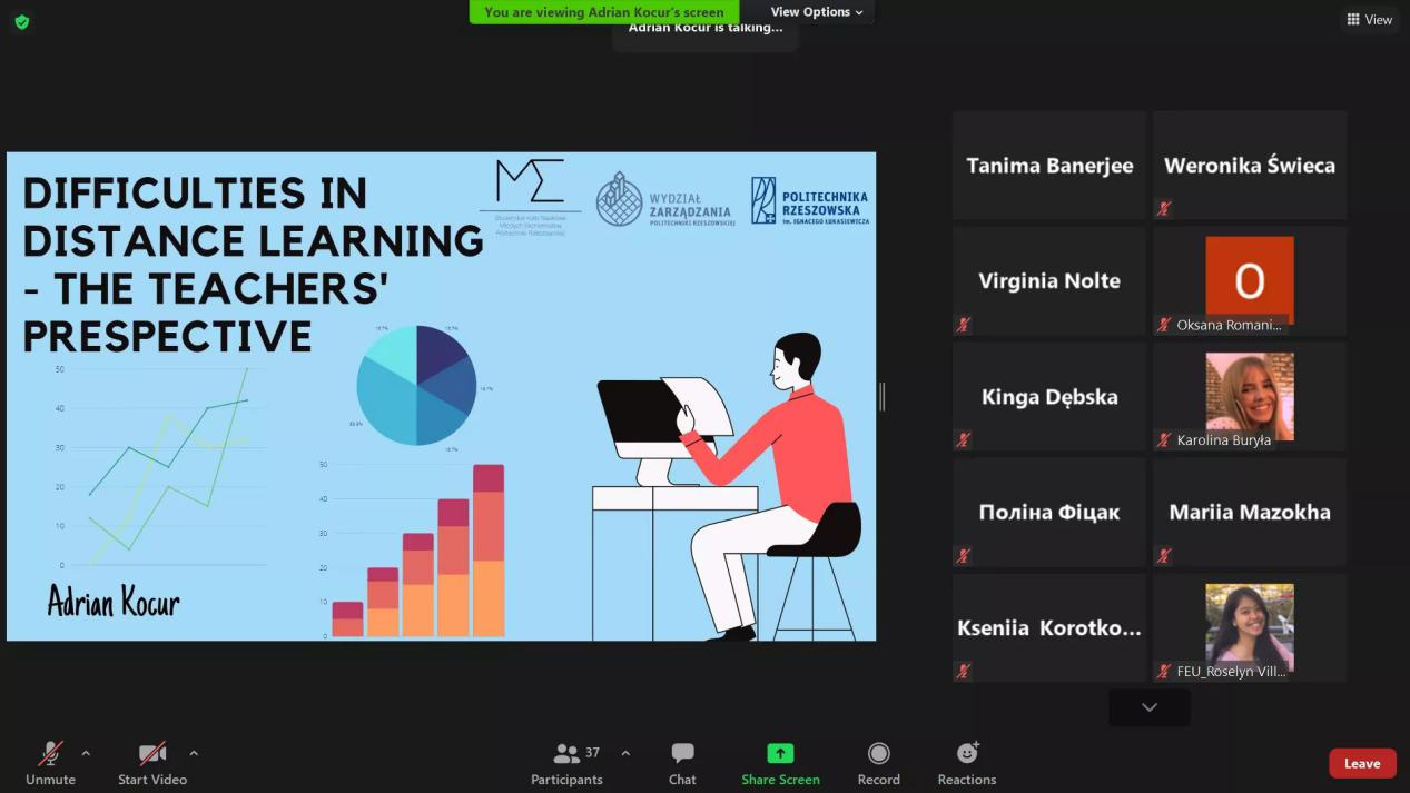 Członkowie interdyscyplinarnego Studenckiego Koła Naukowego Młodych Ekonomistów działającego na Wydziale Zarządzania PRz stanowili dużą grupę wśród wszystkich siedemnastu prelegentów reprezentujących Politechnikę Rzeszowską. Kinga Dębska omówiła kwestię: „Distance learning – the challenge for students”, Adrian Kocur przedstawił prezentację pt.: „Difficulties in distance learning – the teachers' perspective”, Justyna Puzio podjęła temat: „Defects of the public education system”, Norbert Drążek przygotował prezentację pt.: „Distance learning during Covid-19 at universities”, Klaudia Walanus przybliżyła kwestię: „Cybersecurity as a challange for education”, Weronika Świeca zaprezentowała temat: „E-learning as the future solution for education? – advantages and disadvantages of distance learning”, Andrzej Siuda, Krzysztof Strzępek zaprezentowali temat: „The devil’s not so black as he is painted – advantages and disadvantages of e-learning platforms”.