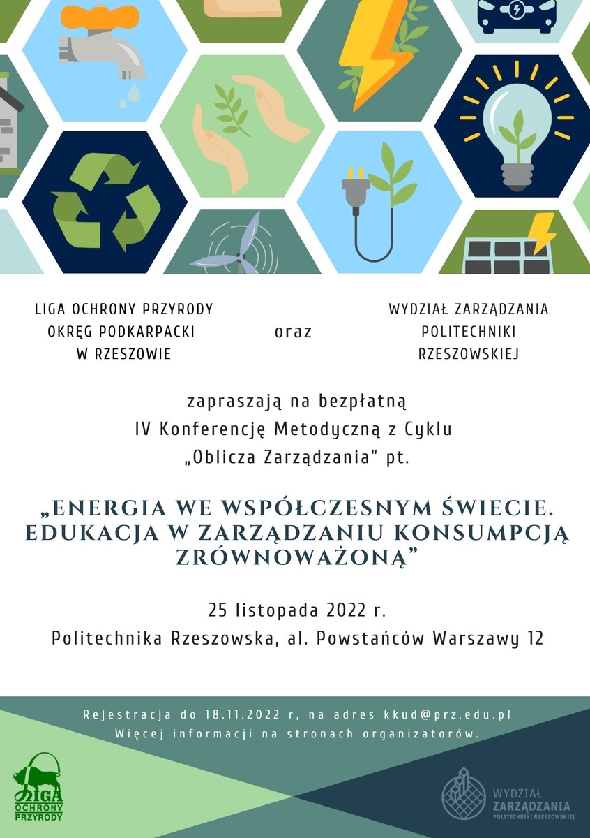 25 listopada 2022 roku Liga Ochrony Przyrody, Okręg Podkarpacki w Rzeszowie oraz Wydział Zarządzania Politechniki Rzeszowskiej im. Ignacego Łukasiewicza organizują IV Konferencję Metodyczną z Cyklu „Oblicza Zarządzania” pt.: „Energia we współczesnym Świecie. Edukacja w zarządzaniu konsumpcją zrównoważoną”.