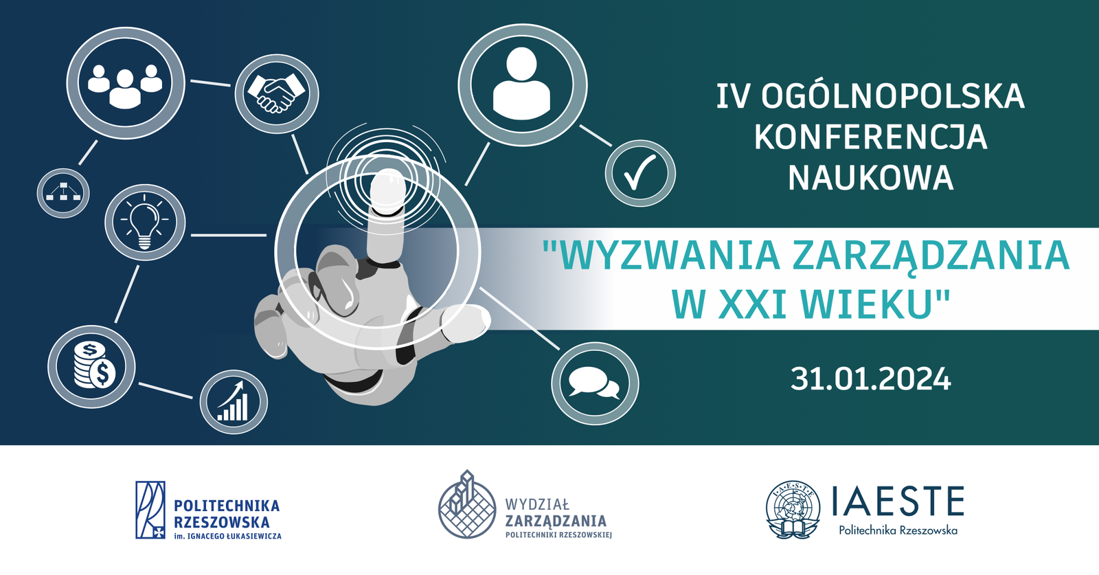 Koło Naukowe IAESTE działające przy Wydziale Zarządzania Politechniki Rzeszowskiej im. Ignacego Łukasiewicza ma zaszczyt zaprosić na IV Ogólnopolską Konferencję Naukową pt.: “Wyzwania Zarządzania w XXI w.”. To wyjątkowe wydarzenie odbędzie się w formie zdalnej, za pośrednictwem platformy MS Teams, 31 stycznia 2024 roku o godzinie 10:00.