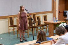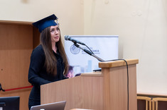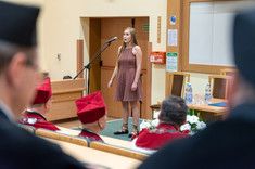 Mgr Agata Wojciechowska – jako przedstawicielka absolwentów – podziękowała w imieniu byłych studentów za wszystkie dobre chwile, jakie spotykały ich zawsze ze strony władz uczelni i Wydziału. Skończyliśmy uczelnię – mówiła A. Wojciechowska – uczcijmy ten fakt i wyrzućmy w górę nasze birety…