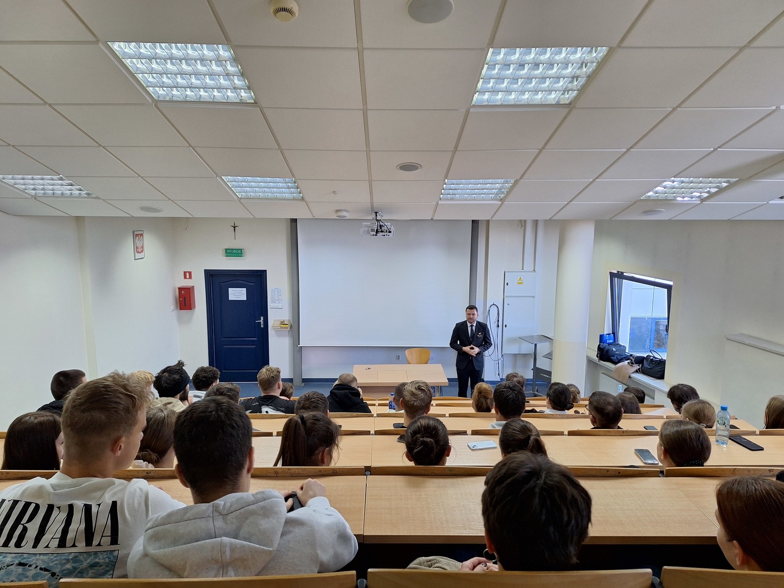 Podczas spotkania Kamil Łuka opowiedział o swojej ścieżce zawodowej, przybliżył realia codziennej pracy na pokładzie samolotu, a także omówił proces rekrutacji i przygotowania do pracy w PLL LOT. Uczestnicy mieli okazję zadać wiele pytań dotyczących zarówno aspektów praktycznych zawodu, jak i wymagań stawianych kandydatom do pracy w transporcie lotniczym.