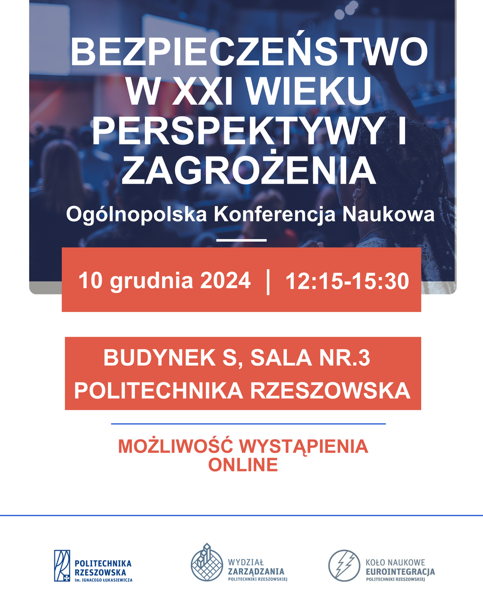 Politechnika Rzeszowska zaprasza na Ogólnopolską Konferencję Naukową pod tytułem „Bezpieczeństwo w XXI wieku – perspektywy i zagrożenia” (Koło naukowe Eurointegracja), która odbędzie się 10 grudnia 2024 roku.