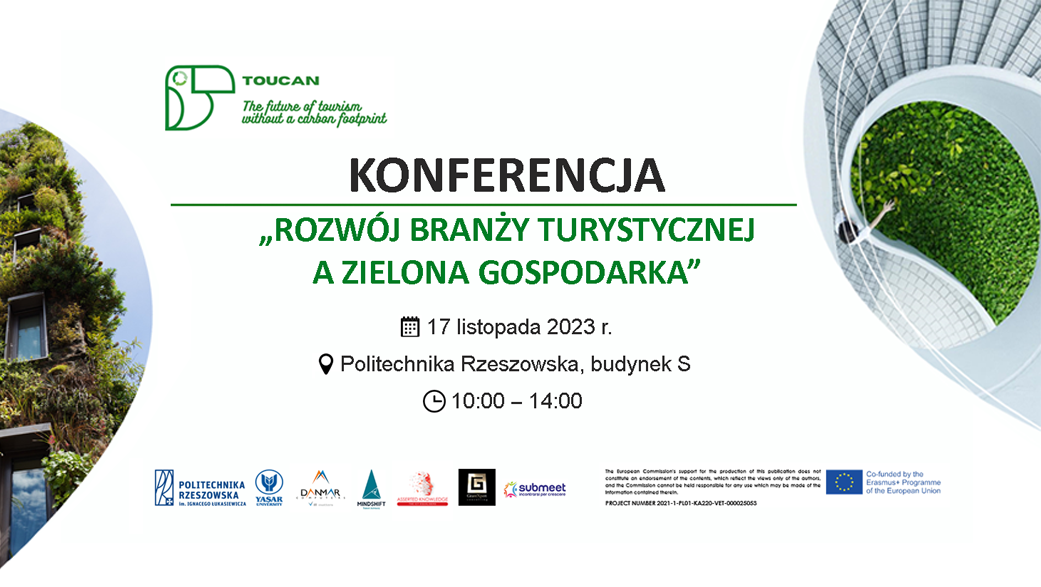 Politechnika Rzeszowska im. Ignacego Łukasiewicza, będąc liderem projektu "TOUCAN: The future of tOUrism without a CArbon footprint", realizowanego w ramach programu Erasmus+, ma zaszczyt zaprosić przedstawicieli branży turystycznej na konferencję pt. „Rozwój branży turystycznej a zielona gospodarka". Wydarzenie odbędzie się 17 listopada 2023 r. (piątek) w godzinach 10:00 - 14:00 w sali 130, w budynku S Politechniki Rzeszowskiej, przy al. Powstańców Warszawy 10 w Rzeszowie.