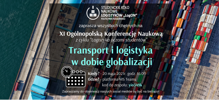 Studenckie Koło Naukowe Logistyków „LogON” serdecznie zaprasza do udziału w XI Ogólnopolskiej Konferencji Naukowej z cyklu „Logistyka oczami studentów” pod tytułem "Transport i logistyka w dobie globalizacji".