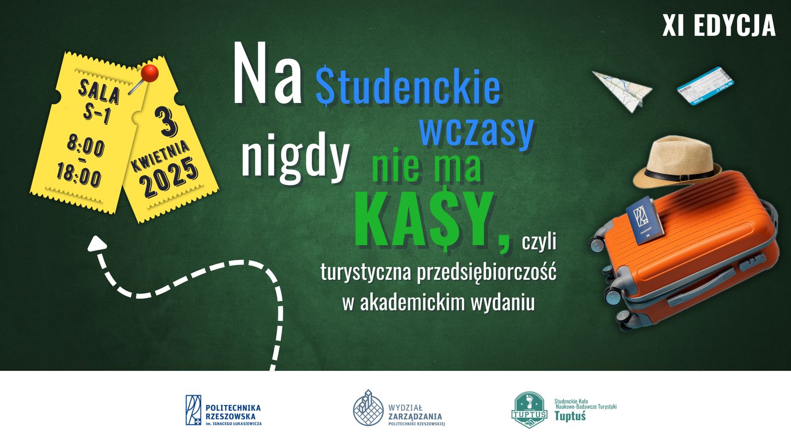 Studenckie Koło Naukowo-Badawcze Turystyki „Tuptuś”, działające przy Zakładzie Ekonomii Wydziału Zarządzania Politechniki Rzeszowskiej, zaprasza na kolejną edycję wydarzenia „Na studenckie wczasy nigdy nie ma kasy, czyli turystyczna przedsiębiorczość w akademickim wydaniu”. Spotkanie odbędzie się 3 kwietnia 2025 roku w sali S1.