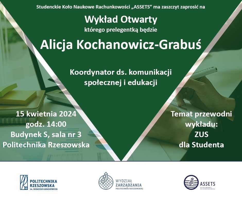 Z ogromną przyjemnością informujemy, że Studenckie Koło Naukowe Rachunkowości "ASSETS" przy Wydziale Zarządzania Politechniki Rzeszowskiej organizuje wyjątkowe spotkanie edukacyjne poświęcone tematyce ubezpieczeń społecznych. Wykład pt. "ZUS dla Studenta" poprowadzi Pani Alicja Kochanowicz-Grabuś, Koordynator ds. komunikacji społecznej i edukacji, która podzieli się swoją wiedzą i doświadczeniem w zakresie funkcjonowania Zakładu Ubezpieczeń Społecznych.
