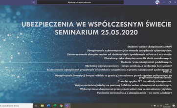 25.05.2020 r., z inicjatywy członków i opiekunów Koła Naukowego Ubezpieczeń, działającego przy ZFBiR WZ, zostało przeprowadzone seminarium online na temat ubezpieczeń we współczesnym świecie.