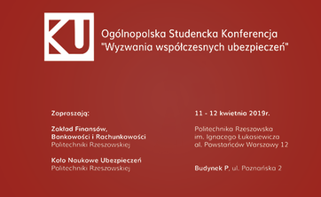 W dniach 11-12 kwietnia br. Koło Naukowe Ubezpieczeń PRz oraz Zakład Finansów, Bankowości i Rachunkowości organizują Ogólnopolską Studencką Konferencję Naukową „Wyzwania współczesnych ubezpieczeń".