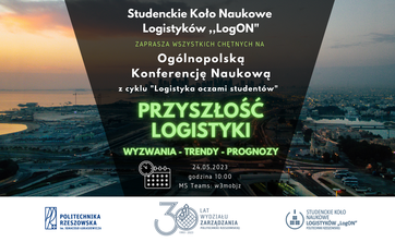 SKNL "LogON" serdecznie zaprasza do udziału w XIII Ogólnopolskiej Konferencji Naukowej z cyklu “Logistyka oczami studentów” pt. "Przyszłość logistyki- wyzwania, trendy, prognozy".
