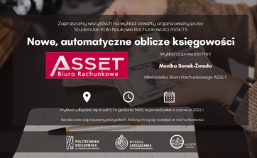 Studenckie Koło Naukowe Rachunkowości "ASSETS" zaprasza na wykład otwarty „Nowe, automatyczne oblicze księgowości”. Spotkanie rozpocznie się w poniedziałek 6.06.2022 r. w sali S1 o godzinie 14:00.