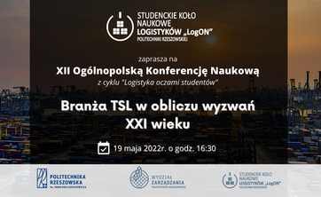 W dniu 19 maja 2022 r. odbędzie się XII Ogólnopolska Konferencja Naukowa z cyklu "Logistyka oczami studenta". Tegoroczny temat to "Branża TSL w obliczu wyzwań XXI wieku". Rozpoczęcie o godzinie 16:30.