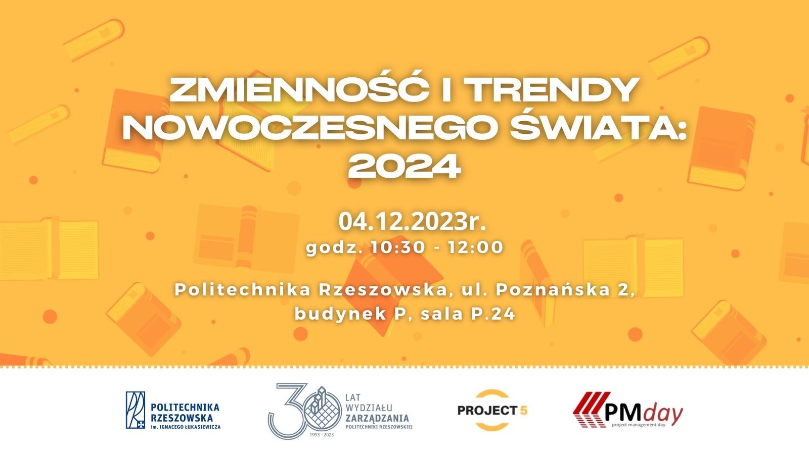 Studenckie Koło Naukowe Zarządzania Projektami Project 5 serdecznie zaprasza na kolejne wydarzenie z cyklu PM Day — tym razem pod hasłem “Zmienność i trendy nowoczesnego świata: 2024”.