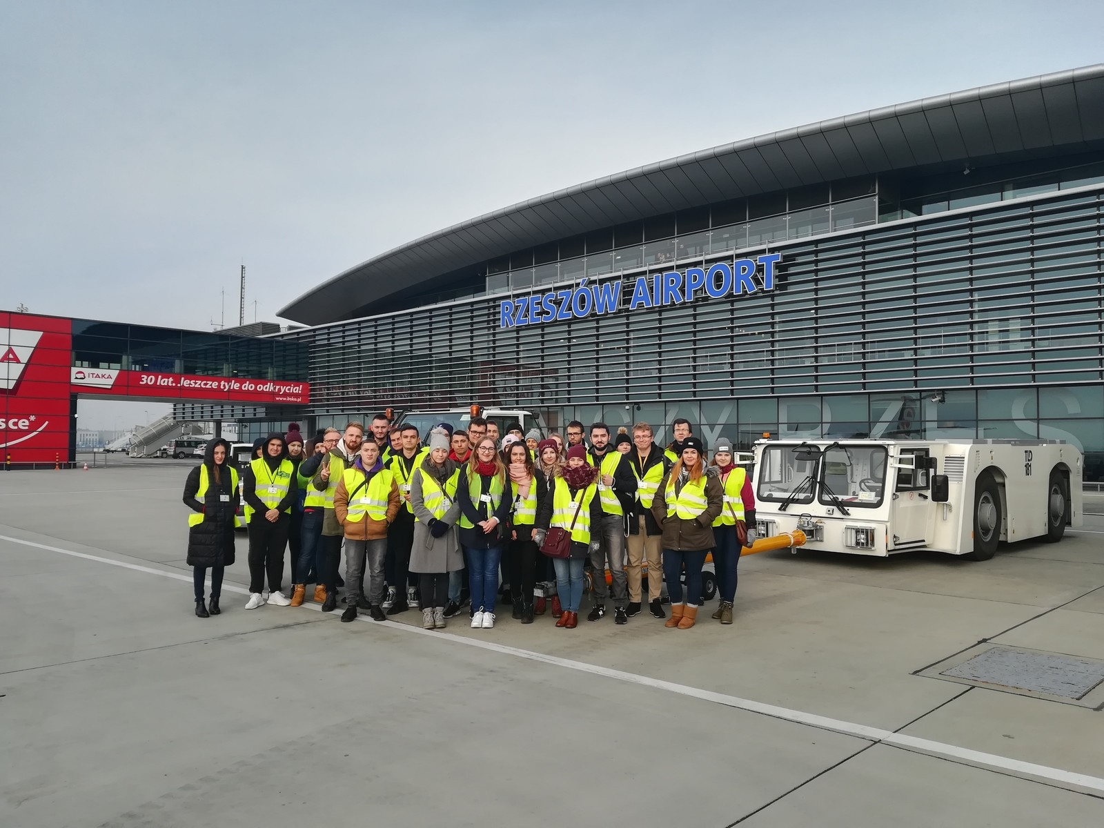 W dniu 29 października 2019 roku odbyły się zajęcia w kształceniu zawodowym praktycznym w Porcie Lotniczym Rzeszów-Jasionka. W zajęciach uczestniczyli studenci piątego semestru kierunku logistyka o specjalizacji obsługa portów lotniczych. Opiekunem zajęć (podobnie jak w latach poprzednich) lat był dr inż. Marek Magniszewski. Studenci zapoznali się z infrastrukturą portu lotniczego, obsługą handlingową statku powietrznego na PPS (płyta postojowa samolotów) oraz urządzeniami będącymi na wyposażeniu Portu Lotniczego. Zapoznali się również z zadaniami służb operacyjnych (dyżurny operacyjny portu, koordynator ruchu naziemnego) w Porcie Lotniczym. Spore zainteresowanie wzbudziła Lotniskowa Służba Ratowniczo-Gaśnicza i jej nowoczesne wyposażenie oraz możliwości bojowe sprzętu ratowniczo-gaśniczego.