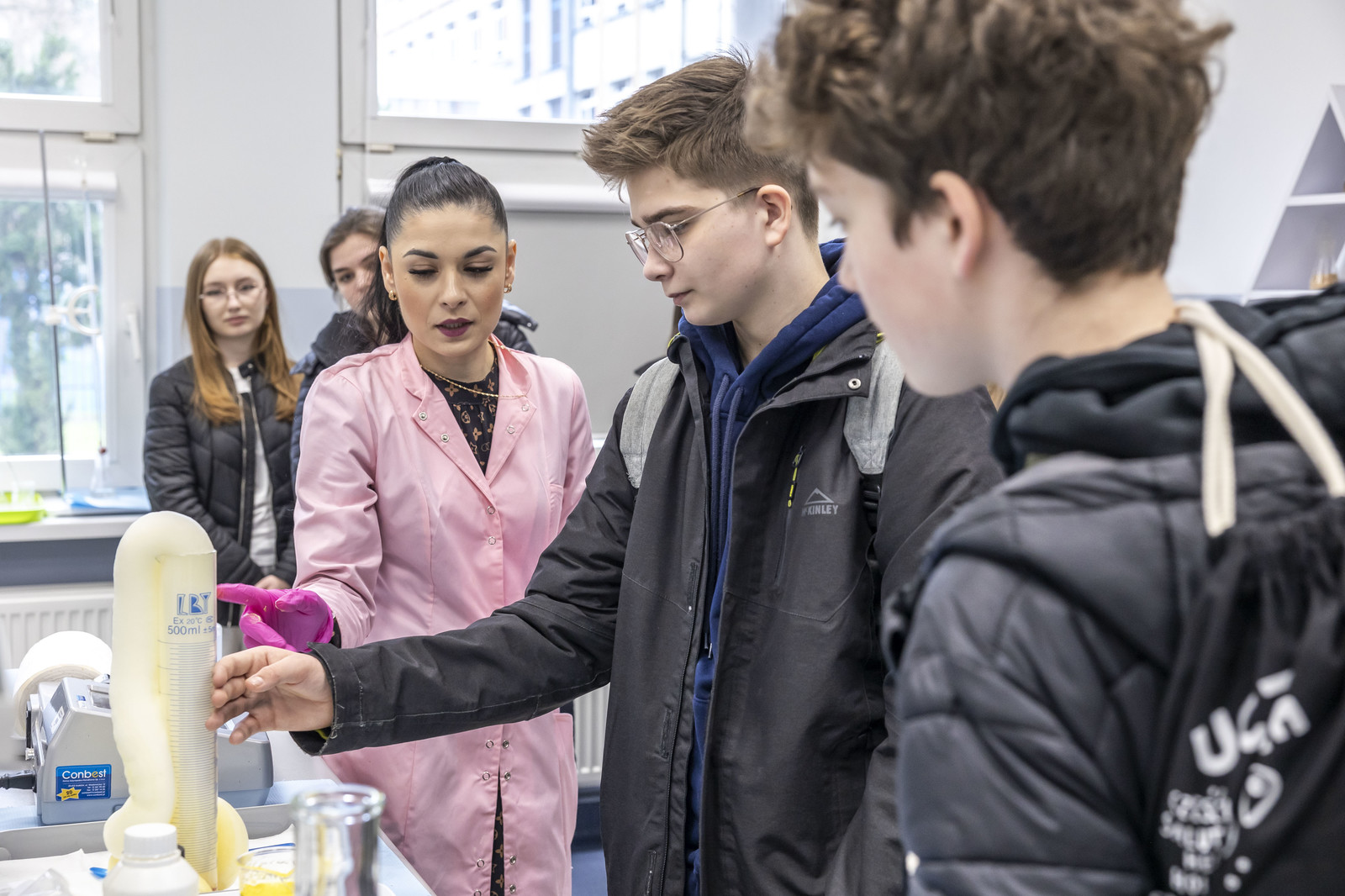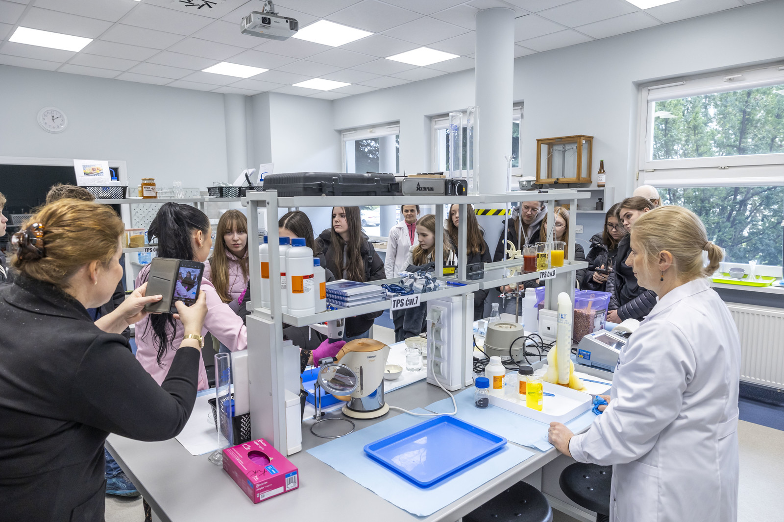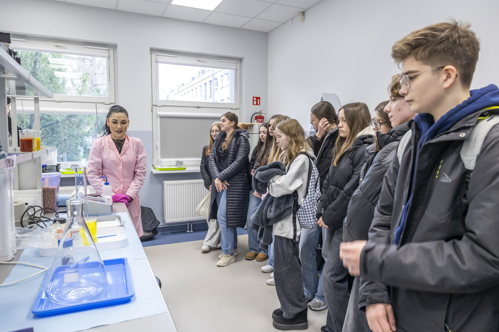 - działalnością laboratorium dydaktycznego towaroznawstwa żywności - uczestnicząc w pokazach doświadczalnych, wśród których znalazły się m.in.: „burza w zlewce”, „parowóz” i „rafa koralowa”, a także zapoznali się ze sposobem realizacji badań żywności, w tym m.in. wykrywania skrobi w jogurcie i określania świeżości jajek za pomocą owoskopu,