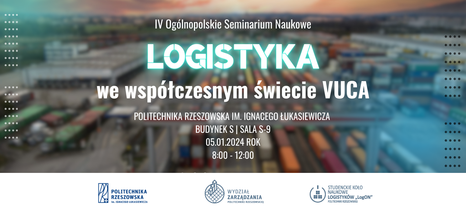 Studenckie Koło Naukowe Logistyków „LogON” funkcjonujące przy Zakładzie Systemów Zarządzania i Logistyki na Wydziale Zarządzania Politechniki Rzeszowskiej serdecznie zaprasza do udziału w IV Ogólnopolskim Seminarium Naukowym "Logistyka we współczesnym świecie VUCA”.