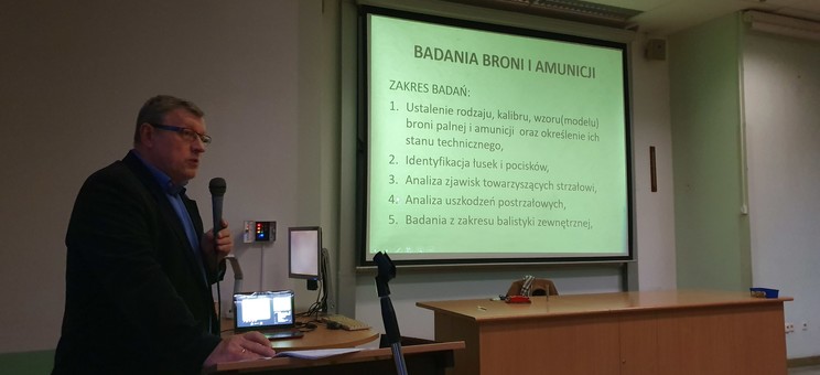 Podczas prelekcji Sylwester Pejas opowiedział o przepisach prawa oraz regulacjach prawnych, które normują kwestie związane z bronią oraz amunicją. Prezentację wzbogacił liczną dokumentacją fotograficzną z opinii, które realizował na zlecenie wymiaru sprawiedliwości oraz organów ścigania. Studenci kierunku bezpieczeństwo wewnętrzne mieli możliwość zapoznania się z kluczowymi działaniami, podejmowanymi w czasie ekspertyz.