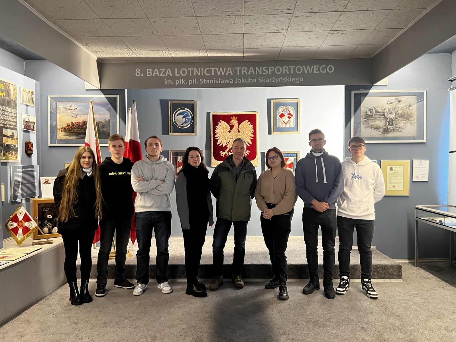 Wizyta rozpoczęła się od zwiedzenia Sali Tradycji 8. BLTr, gdzie studenci zapoznali się z historią lotniska w Balicach. Kraków był jednym z trzech ośrodków formowania się polskiego lotnictwa wojskowego i już 7 listopada 1918 roku utworzono tutaj Pierwszą Eskadrę Bojową. Następnie dzięki uprzejmości ppłk. pil. Roberta TURKA, który w imieniu dowódcy Bazy przywitał gości, studenci zapoznali się z wyzwaniami, przed którymi stoi polskie lotnictwo transportowe.