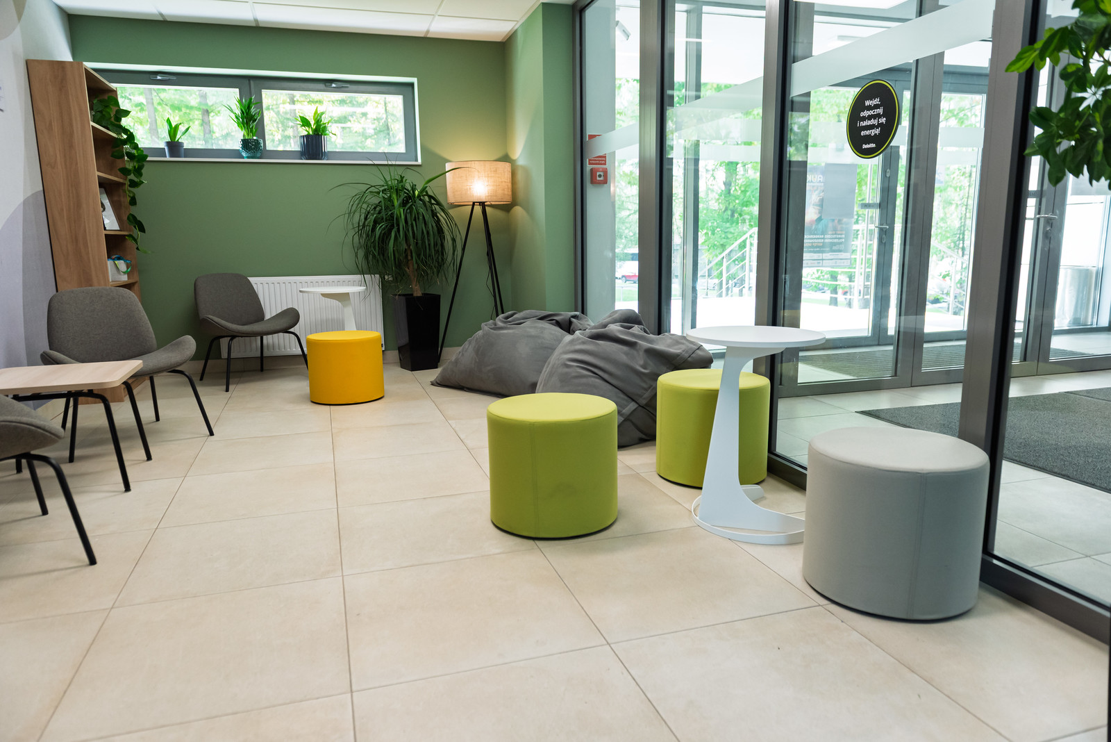 - część pierwsza, zlokalizowana w holu budynku S, została wyposażona w zestaw wypoczynkowy: sofy, stoliki i krzesła,