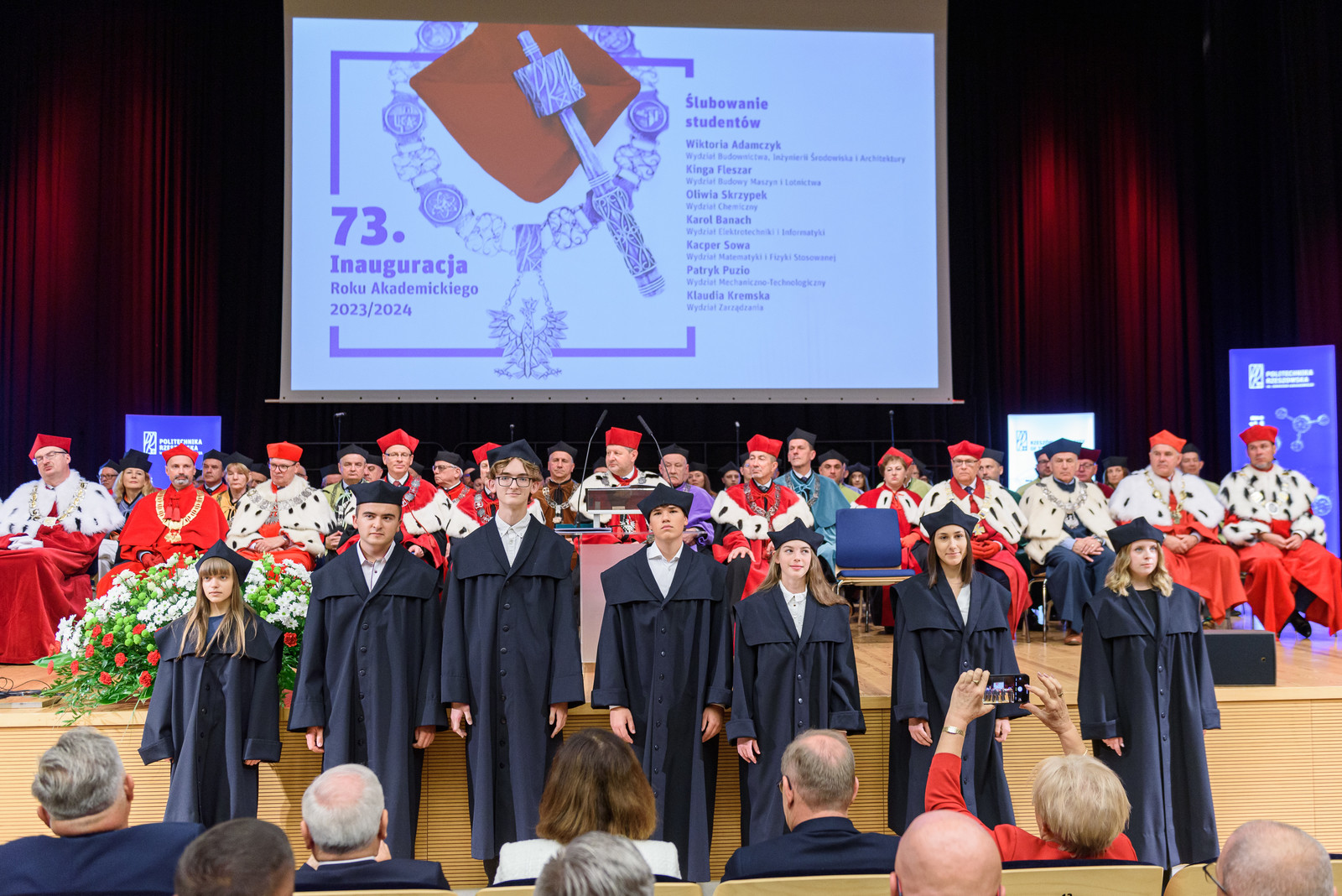 W ramach uroczystości inauguracji odbyło się ślubowanie przedstawicieli studentów pierwszego roku oraz przedstawicieli doktorantów Szkoły Doktorskiej Nauk Inżynieryjno-Technicznych PRz, które poprowadzili kolejno: prorektor ds. kształcenia dr hab. Iwona Włoch, prof. PRz oraz prorektor ds. nauki dr hab. inż. Lesław Gniewek. Pasowania studentów i doktorantów dokonał prof. PRz. JM Rektor.