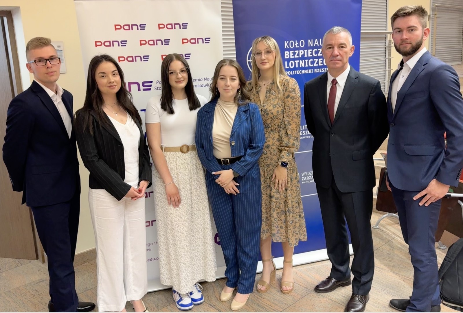 Ważną częścią wydarzenia była sesja studencka, będąca przestrzenią prezentacji autorskich projektów badawczych, referatów oraz posterów związanych tematycznie z głównym nurtem konferencji. Wśród jej uczestników znaleźli się również studenci Wydziału Zarządzania Politechniki Rzeszowskiej: Gabriela Jachimowicz, Seweryn Walas, Klara Nowak, Katarzyna Panek, Angelika Niemczyk i Jakub Kamyk – członkowie Koła Naukowego Bezpieczeństwa Lotniczego „Eskadra”.