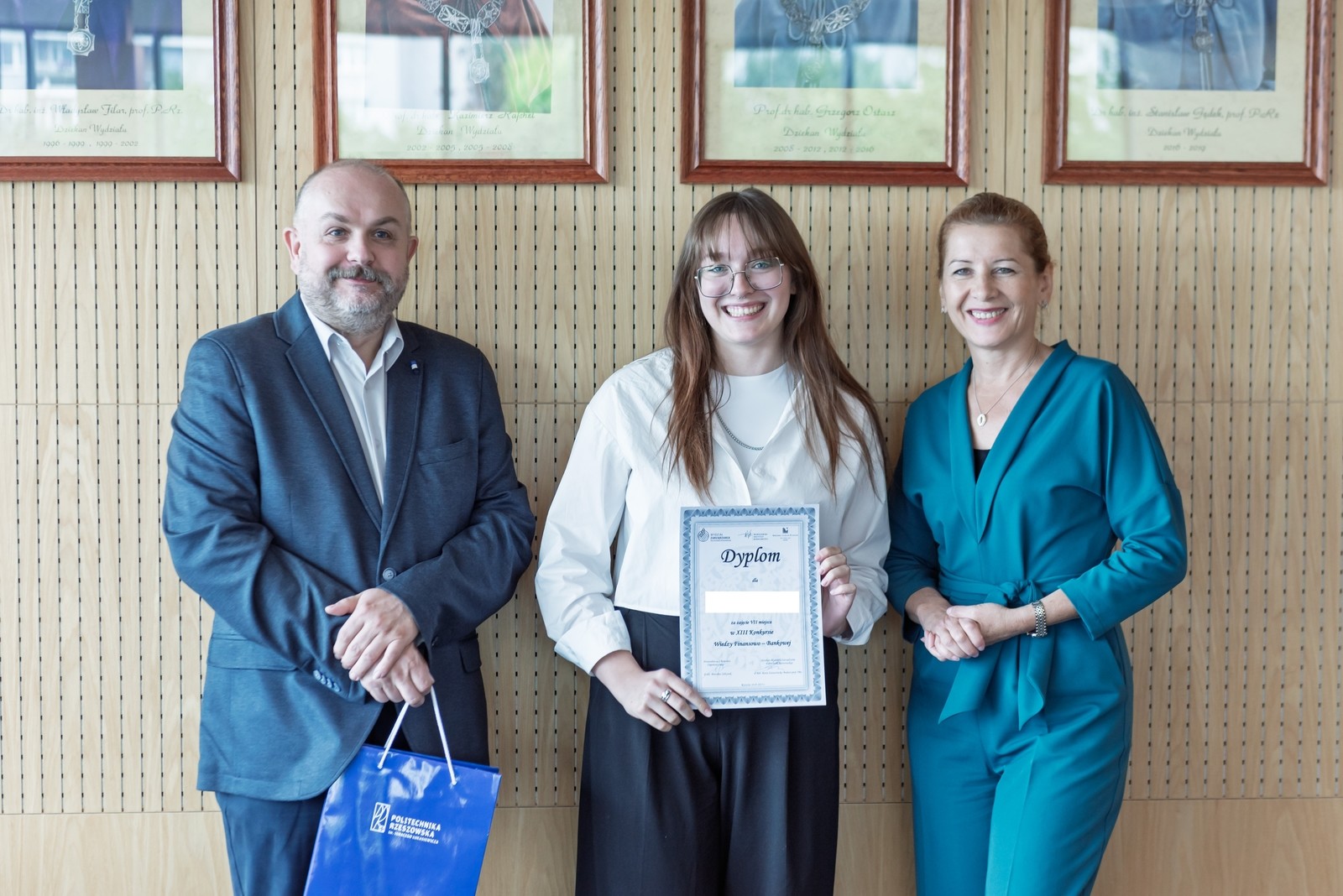 W trakcie uroczystego podsumowania XIII edycji Konkursu Wiedzy Finansowo–Bankowej wszyscy finaliści otrzymali z rąk dziekan Wydziału Zarządzania, dr hab. Beaty Zatwarnickiej–Madury, prof. PRz, dyplomy oraz nagrody rzeczowe ufundowane przez prorektor ds. kształcenia, dr hab. Iwonę Włoch, prof. PRz, prorektora ds. studenckich i umiędzynarodowienia, dr hab. inż. Bartosza Millera, prof. PRz, oraz partnerów Konkursu.