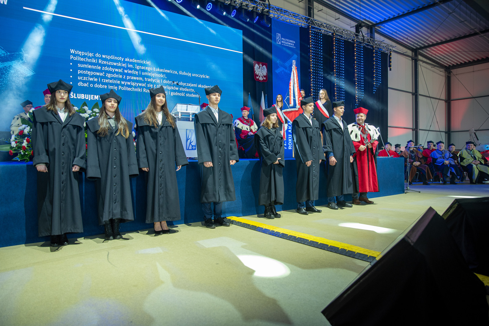 Najważniejszą częścią inauguracji nowego roku akademickiego było pasowanie studentów i doktorantów pierwszego roku, poprzedzone ich ślubowaniem. Tę część uroczystości poprowadzili prorektor ds. kształcenia dr hab. Iwona Włoch, prof. PRz oraz prorektor ds. nauki dr hab. inż. Lesław Gniewek, prof. PRz.