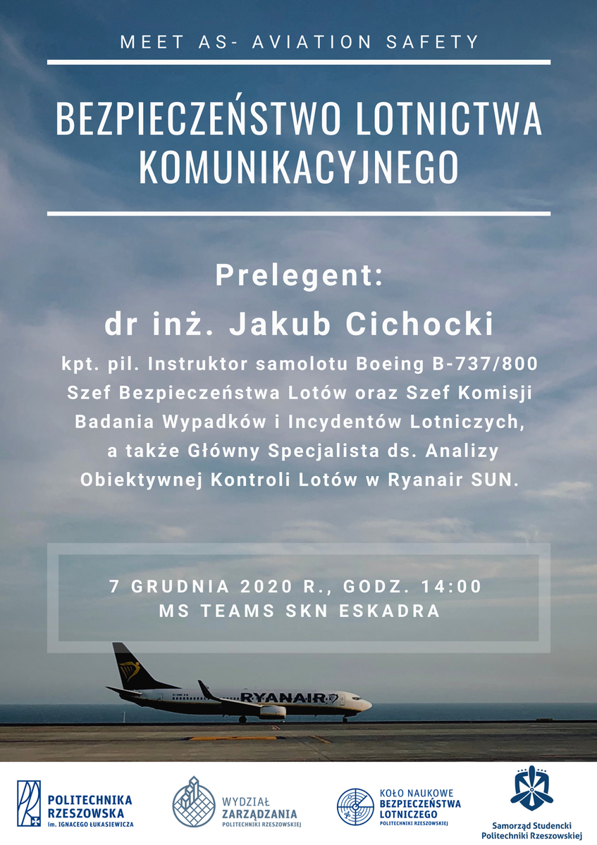 Jak już informowaliśmy, studenci zrzeszeni w Kole Naukowym Bezpieczeństwa Lotniczego „Eskadra” działającym przy Wydziale Zarządzania PRz realizują przedsięwzięcie „Meet AS – Aviation Safety”, które polega na organizacji otwartych spotkań online ze specjalistami i praktykami z branży lotniczej. Głównym celem serii spotkań online jest przybliżenie studentom praktycznej wiedzy z sektora lotnictwa cywilnego.