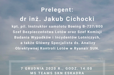 W ramach cyklu, w dniu 7 grudnia 2020 r. o godzinie 14.00 rozpocznie się kolejny wykład online pt. „Bezpieczeństwo lotnictwa komunikacyjnego”. Prelegentem będzie dr inż. Jakub Cichocki, kpt. pil. instruktor samolotu Boeing B-737/800, Szef Bezpieczeństwa Lotów – Ryanair SUN, Szef Komisji Badania Wypadków i Incydentów Lotniczych oraz Główny Specjalista ds. Analizy Obiektywnej Kontroli Lotów – Ryanair SUN