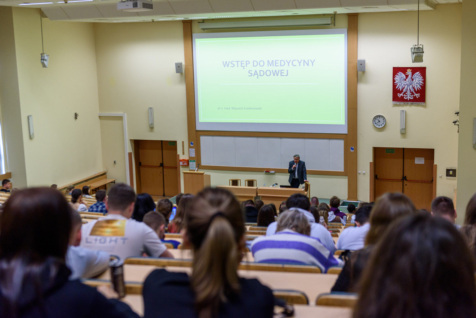 Czym jest medycyna sądowa? Kim jest lekarz medycyny sądowej? Jakie znaczenie dla pracy organów śledczych i organów wymiaru sprawiedliwości ma ta dziedzina nauki? To tylko wstęp do zagadnień poruszonych na wykładzie przez dr. n. med. Wojciecha Kwietniewskiego – kierownika Zakładu Medycyny Sądowej i Prawa Medycznego Uniwersytetu Rzeszowskiego. Studenci, którzy licznie uczestniczyli w spotkaniu, mieli okazję zapoznać się z podstawami tanatologii - nauki o śmierci. Diagnostyka sekcyjna poprzedzona oględzinami zewnętrznymi zwłok i sekcją zwłok to czynności niezbędne do wyjaśnienia mechanizmu śmierci i ustalenia czy organy śledcze mają do czynienia ze zbrodniczym pozbawieniem życia, czy też śmiercią samobójczą bądź nieszczęśliwym wypadkiem. Różnicując te podstawowe pojęcia specjalista medycyny sądowej, prezentując studentom bogaty materiał poglądowy, prelegent podjął się odpowiedzi na pytanie „Co mówią zwłoki?”. Ustalenie czasu, miejsca śmierci, nie zawsze tożsamego z miejscem znalezienia zwłok, mechanizmu powstania obrażeń, narzędzia, którym spowodowano obrażenia, to tylko wycinek możliwości jakie śledczym daje właśnie medycyna sądowa. Dr Wojciech Kwietniewski, wielokrotnie zwracał słuchaczom uwagę na potrzebę rozróżnienia fikcji filmowej czy literackiej, w której prezentuje się patologów, medyków sadowych jako jasnowidzów, wnioskujących niejednokrotnie już na miejscu ujawnienia zwłok o mechanizmie śmierci i udziale osób trzecich od rzeczywistości. Diagnostyka sekcyjna zwłok to żmudna i skomplikowana materia, wymagająca wiedzy i czasu lekarzy medycyny sądowej.