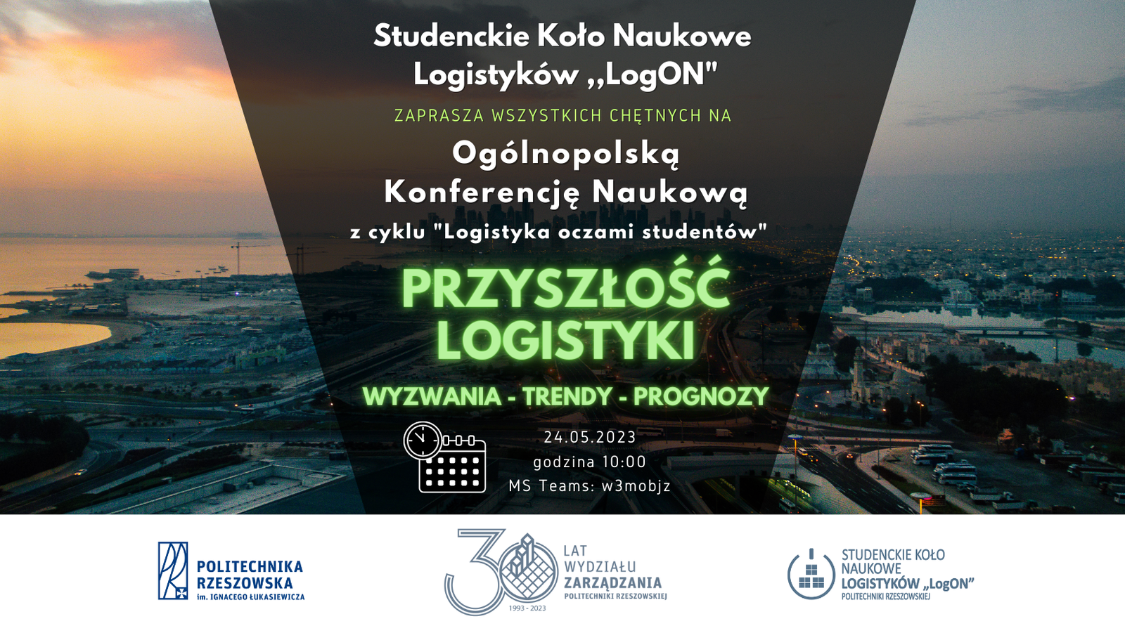 Studenckie Koło Naukowe Logistyków „LogON” funkcjonujące przy Zakładzie Systemów Zarządzania i Logistyki na Wydziale Zarządzania Politechniki Rzeszowskiej serdecznie zaprasza do udziału w XIII Ogólnopolskiej Konferencji Naukowej z cyklu “Logistyka oczami studentów” pt. "Przyszłość logistyki- wyzwania, trendy, prognozy".