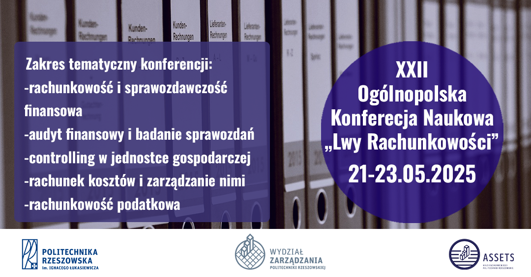 Studenckie Koło Naukowe Rachunkowości ASSETS zaprasza na XXII edycję Ogólnopolskiej Konferencji Naukowej “Lwy Rachunkowości” oraz XV edycję konkursu ASSETS COMPETITION. Wydarzenie odbędzie się stacjonarnie w dniach 21-23 maja 2025 roku, na terenie Politechniki Rzeszowskiej im. Ignacego Łukasiewicza.