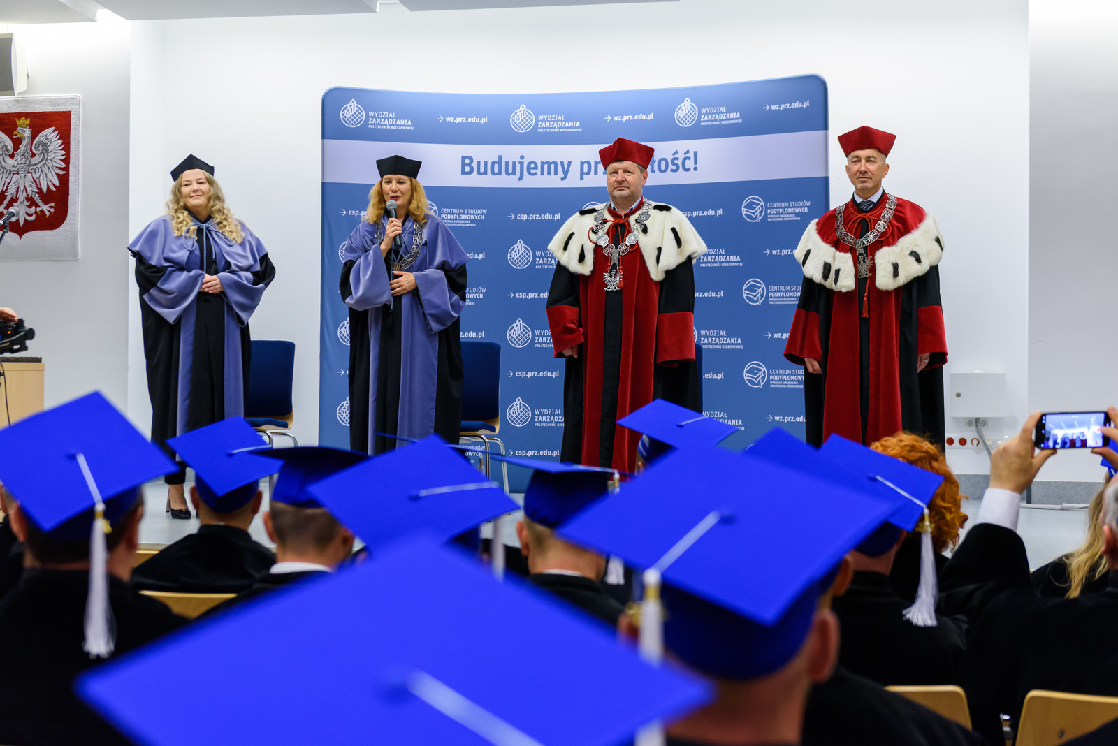 Uroczystość uświetnili swoją obecnością prof. dr hab. inż. Piotr Koszelnik – rektor Politechniki Rzeszowskiej, prof. dr hab. Grzegorz Ostasz – prorektor PRz ds. studenckich i kierownik Centrum Studiów Podyplomowych Wydziału Zarządzania PRz. W ceremonii wzięły udział również: dr hab. Beata Zatwarnicka-Madura, prof. PRz – dziekan Wydziału Zarządzania Politechniki Rzeszowskiej i kierownik studiów MBA oraz dr Justyna Stecko – prodziekan Wydziału Zarządzania ds. kształcenia.