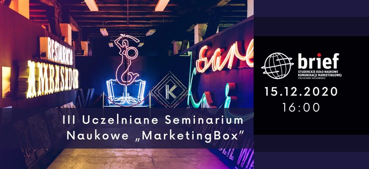 Studenckie Koło Naukowe Komunikacji Marketingowej „Brief” serdecznie zaprasza na III Uczelniane Seminarium Naukowe „MarketingBox”, które odbędzie się online 15 grudnia 2020 roku o godzinie 16:00. Studenci, którzy zgłosili swój udział a tym wydarzeniu zaprezentują swoje doświadczenia, podzielą się naukowymi pasjami i wiedzą w następujących obszarach tematycznych:
