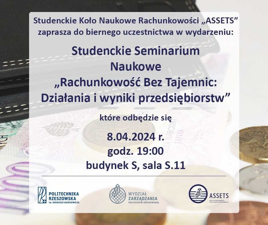 Studenckie Koło Naukowe Rachunkowości ASSETS ma przyjemność zaprosić wszystkich zainteresowanych na wyjątkowe wydarzenie - Studenckie Seminarium Naukowe: Rachunkowość Bez Tajemnic: Działania i wyniki przedsiębiorstw. Seminarium to będzie doskonałą okazją do zgłębienia wiedzy z zakresu rachunkowości oraz do wymiany doświadczeń z ekspertami i pasjonatami tej dziedziny.