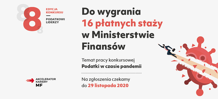 Więcej informacji (w tym warunki procesu rekrutacyjnego) na stronie: https://www.gov.pl/web/finanse/konkurs-mf-zmierz-sie-z-podatkowymi-wyzwaniami-okresu-pandemii-i-zostan-podatkowym-liderem2